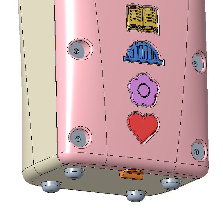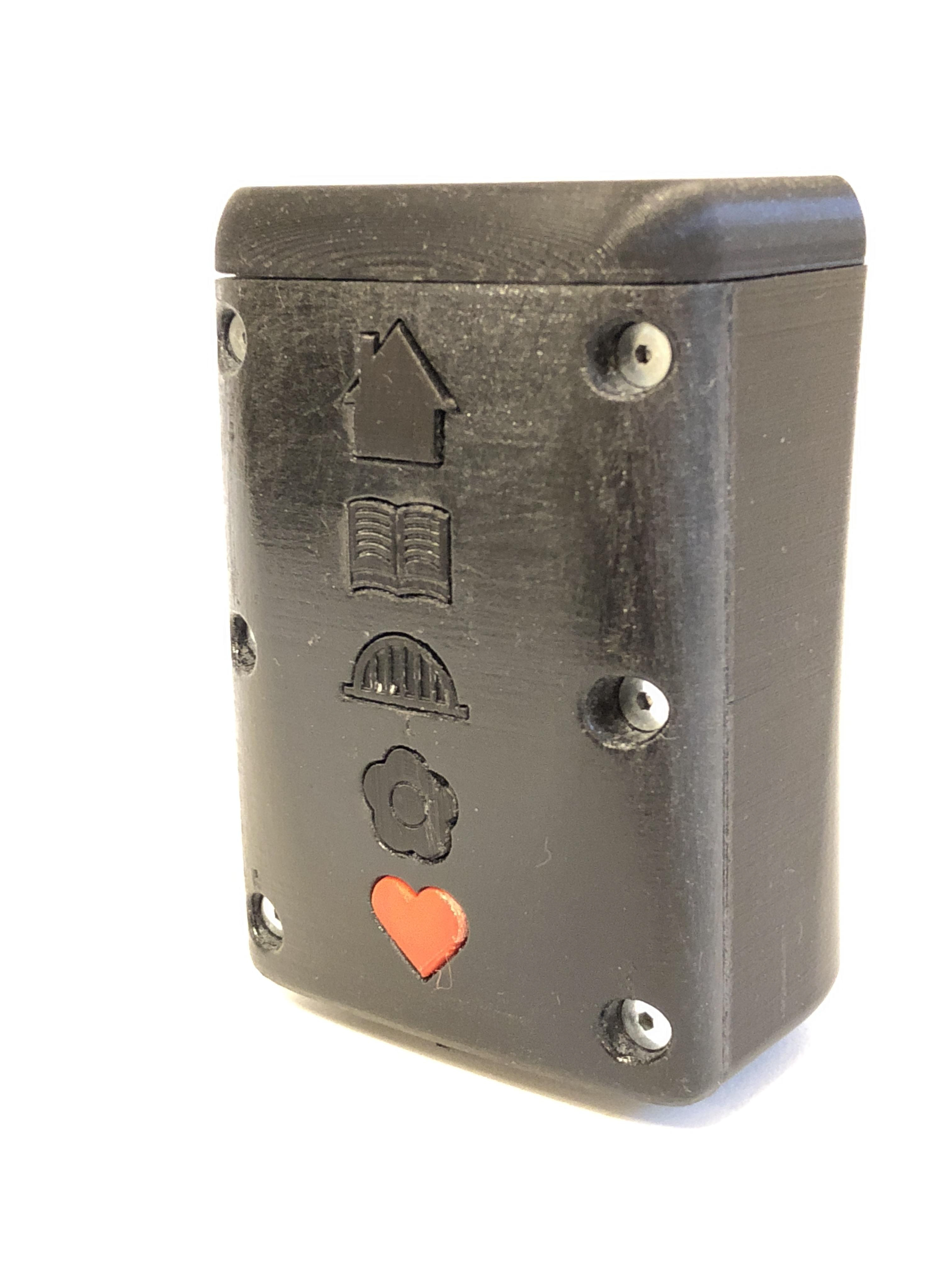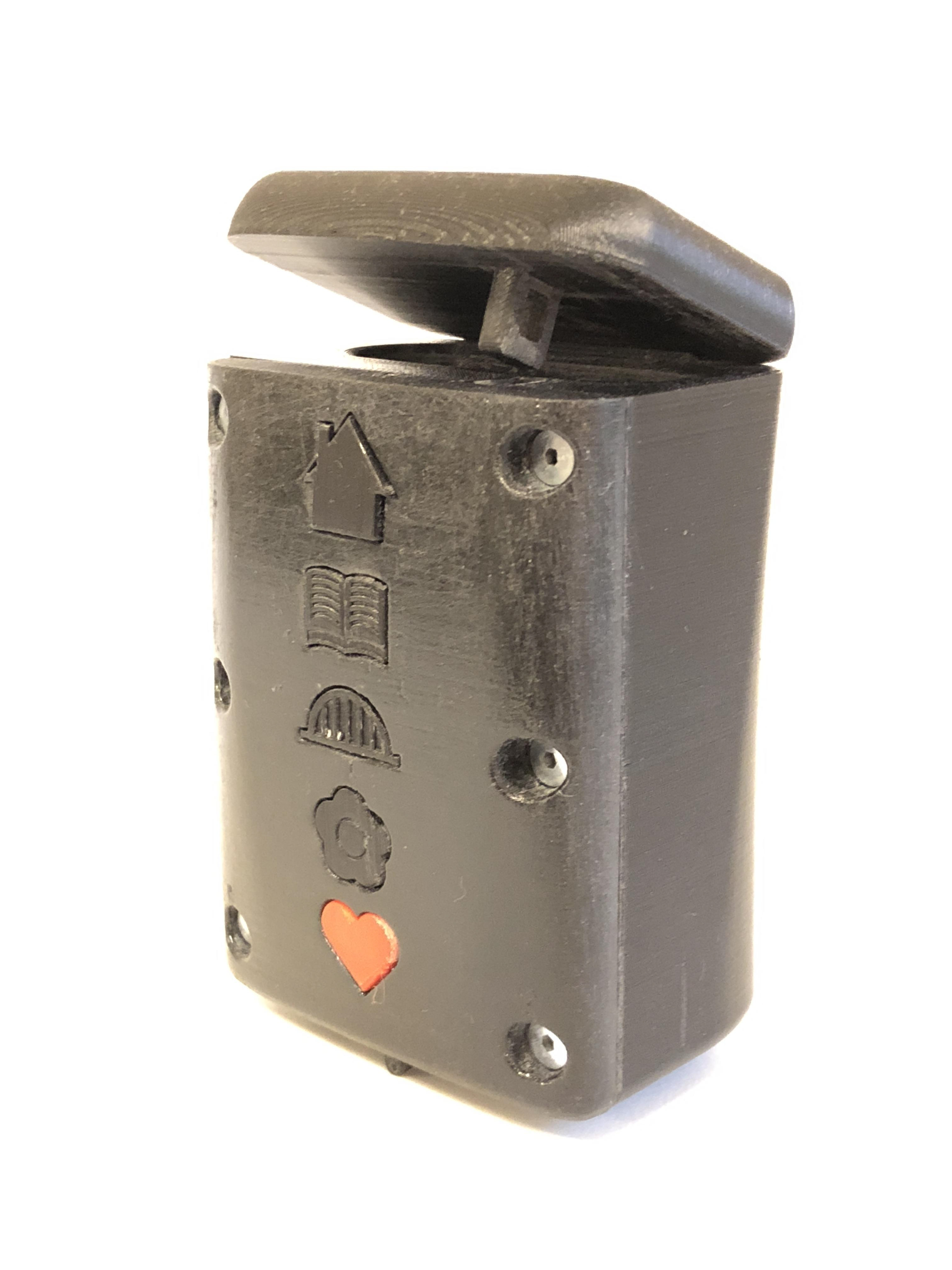 The under side of the box, showing the key head and standoffs so the key can remain inside