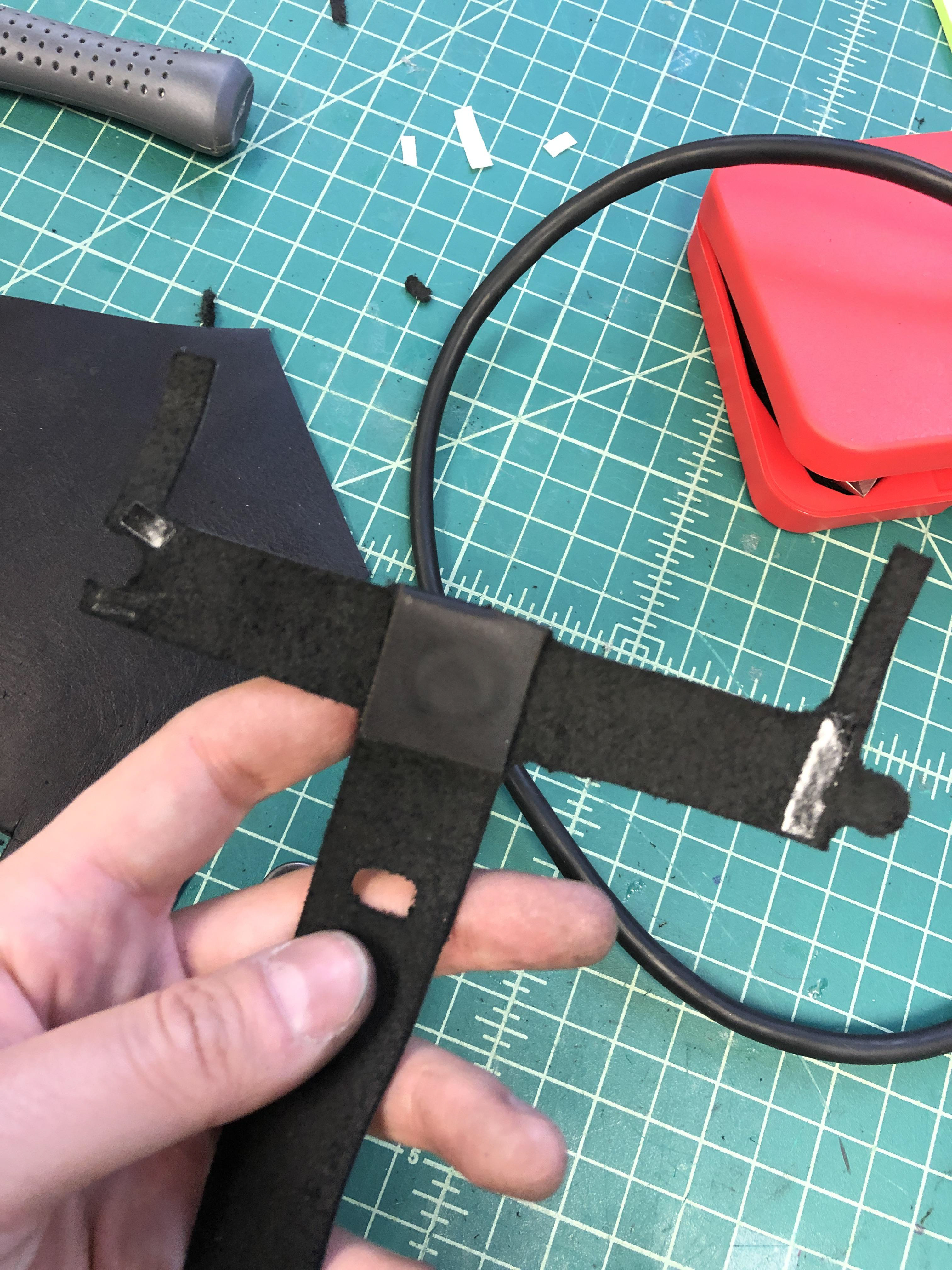 After smashing the button snap in, the top flap was folded over to prevent scratching against the case. It was secured using a Bemis hot-melt adhesive. The pill cutout is to allow for lightning charging of the case, and the puzzle-piece-shaped backing was an homage to Steph's love for puzzles.