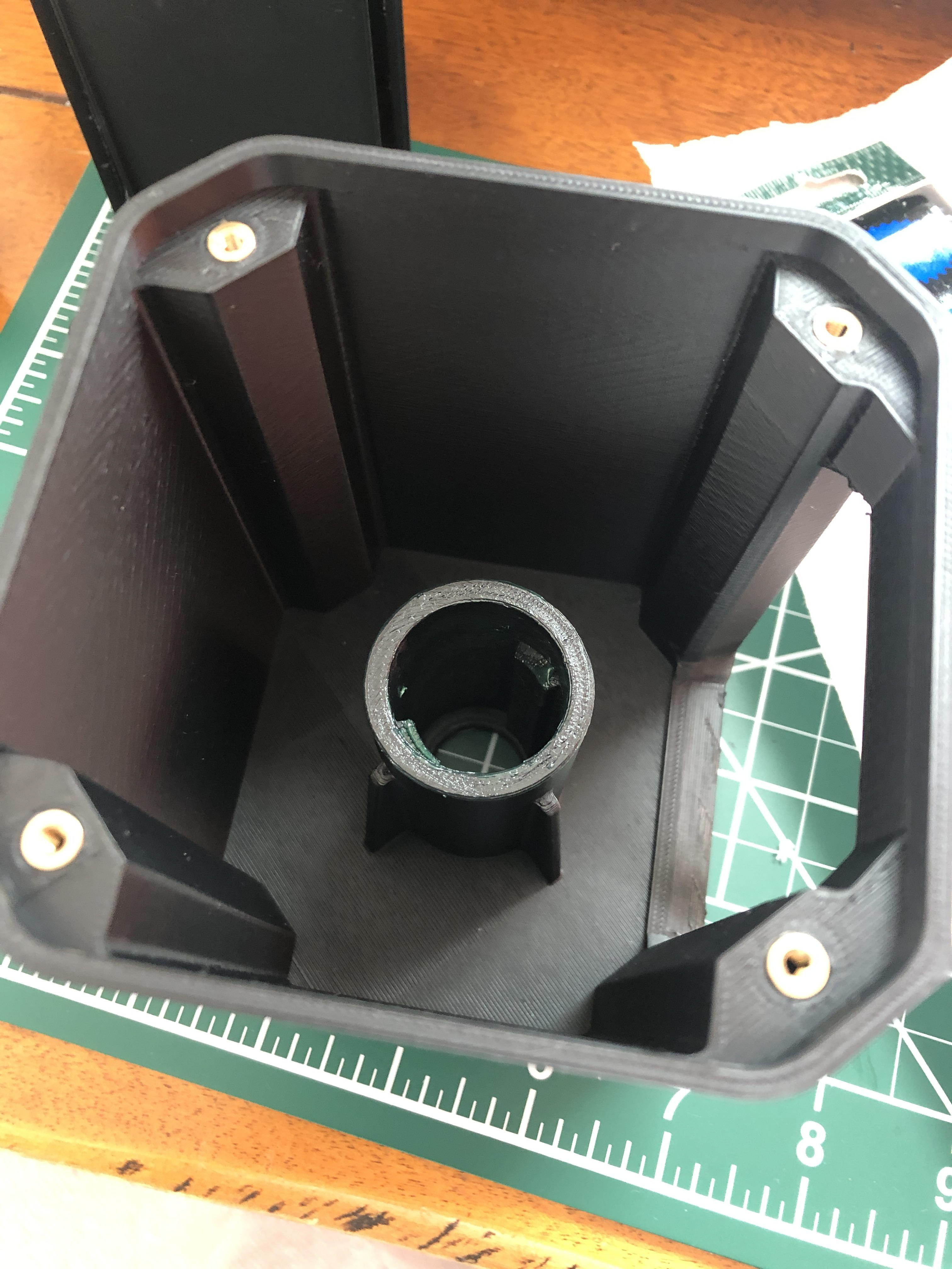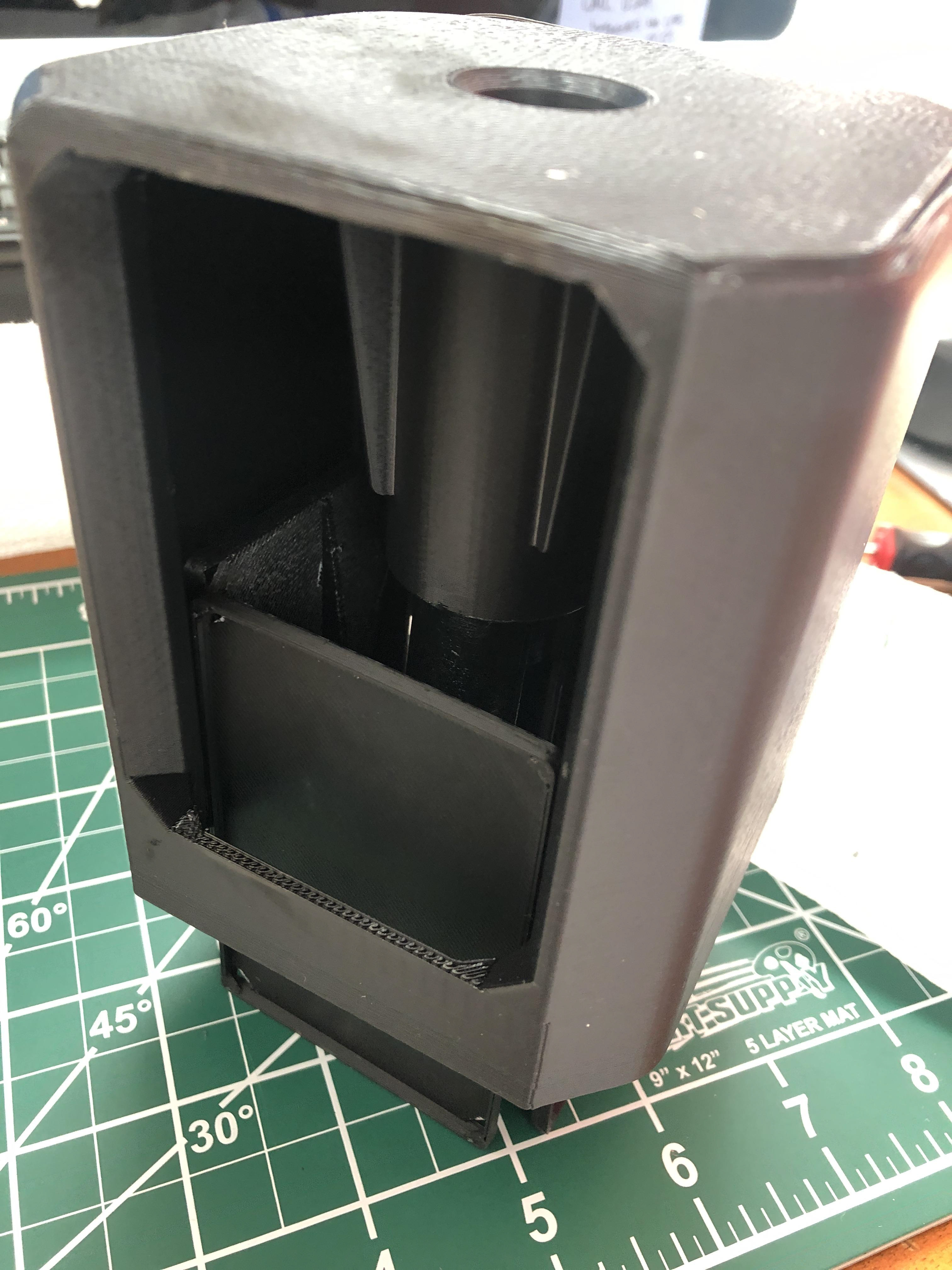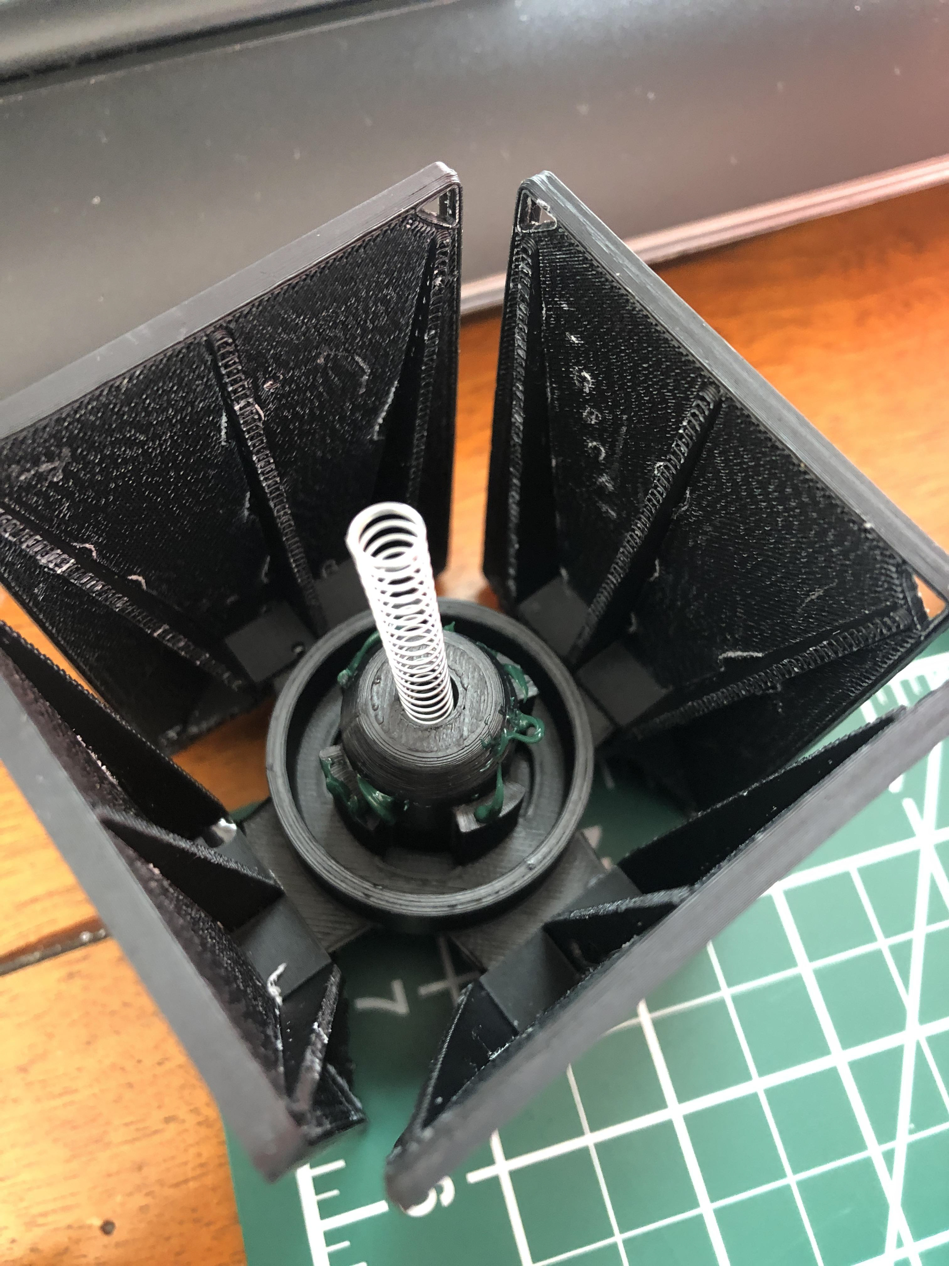 The size of the box is defined by the photo size. The ratchet spacing of 90 degrees is defined by the number of photos to fit in the box. The spring force was determined by ease of user push force, and the ramp angles were defined by the spring force. Grease was added to help lubricate the components because of the layering resolution of the FDM printer.