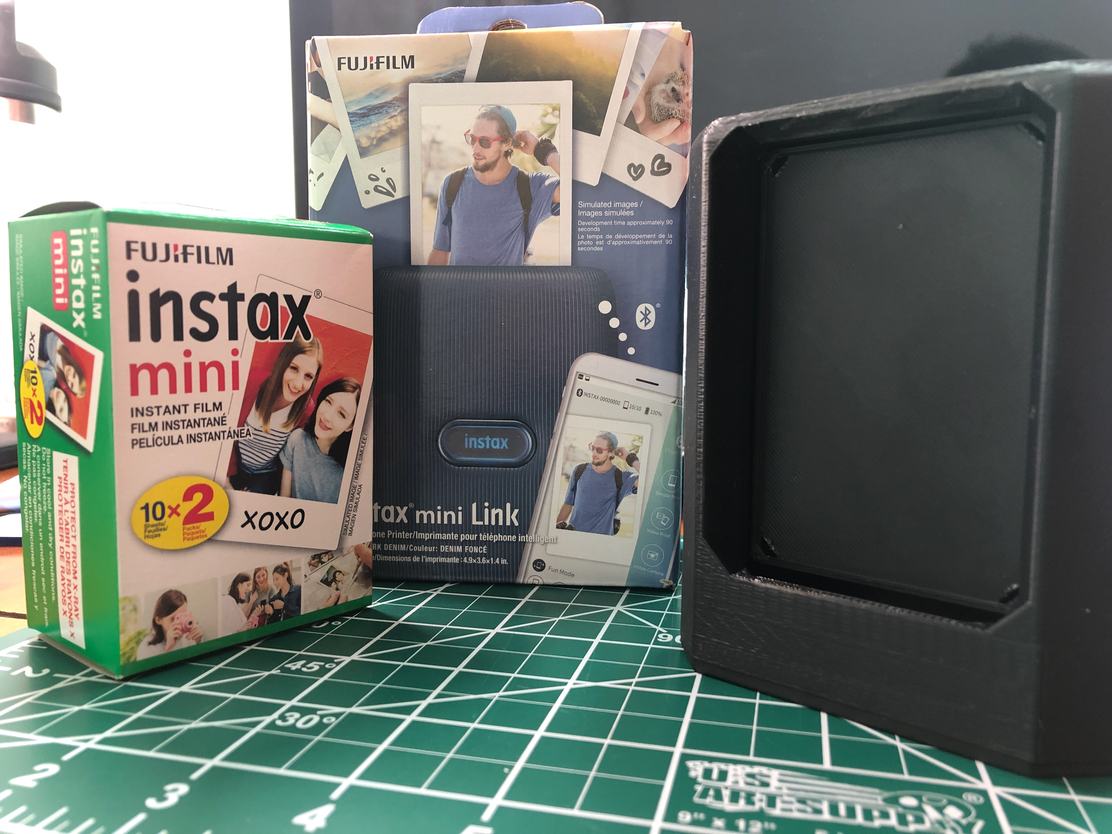 The Fujifilm Instax printer for digital photos to be transferred to analog format, along with the completed photo flipper.