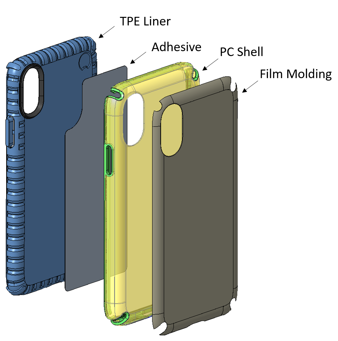 My role on the project was to oversee the design engineering, material selection, adhesive validation, and IML integration for all cases dating back to iPhone 6s. This huge initiative was a massive refresh to Speck's premium product line, and our largest launch in company history. It also introduced a flagship product to our offerings, the Presidio Armor Cloud. It required constant collaboration with Industrial Design, Marketing, CMF, and contract manufacturing teams. The armor cloud case introduced an in-mold-laminated (IML) graphic, with a "halo" overmolded bezel to help expose and celebrate the air-pocket technology.
